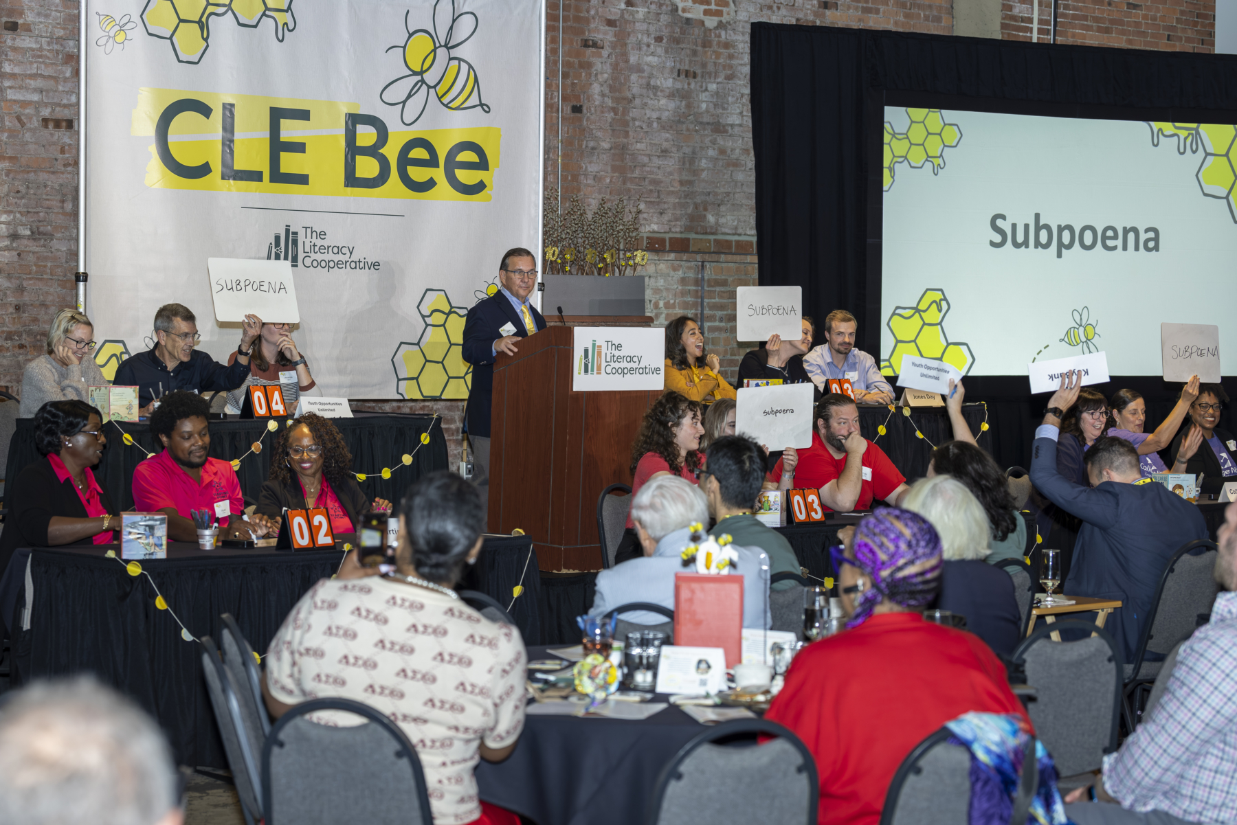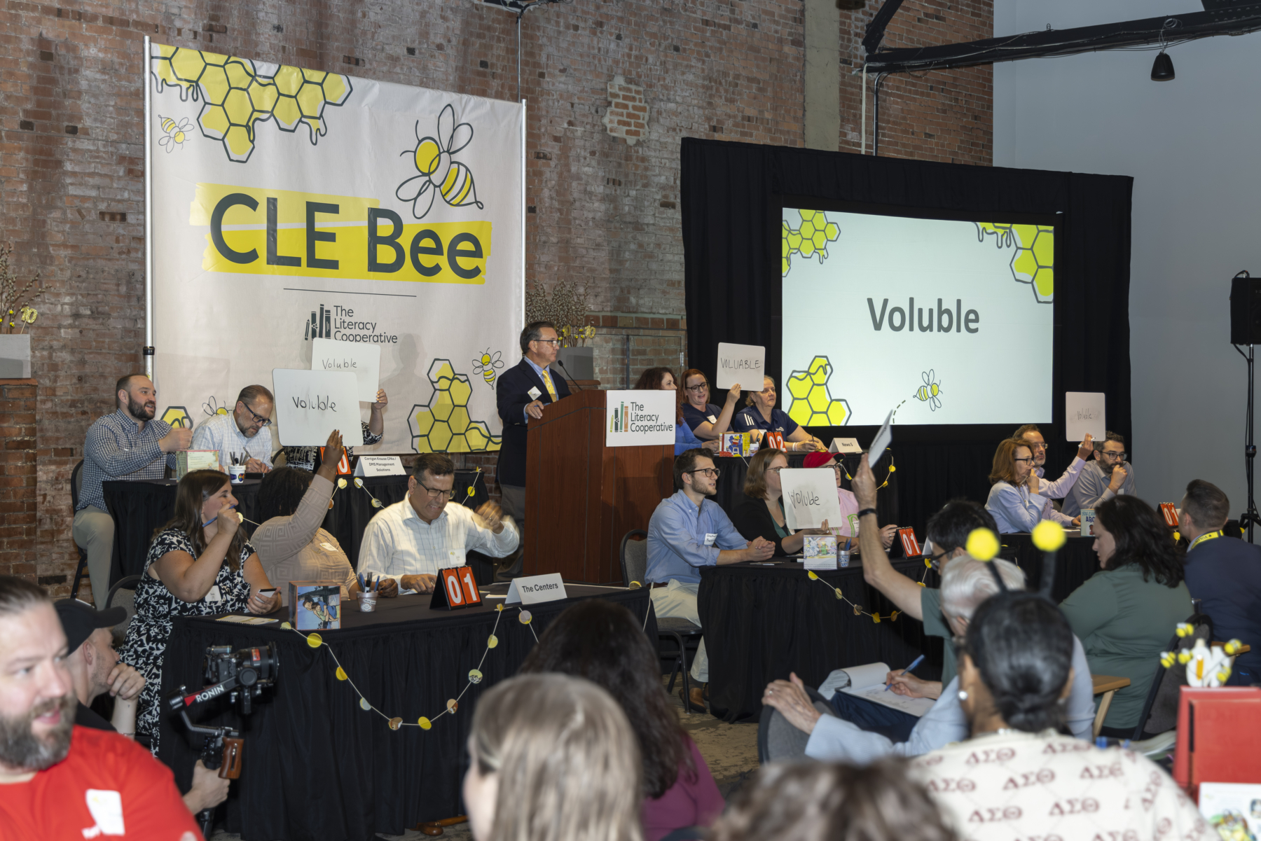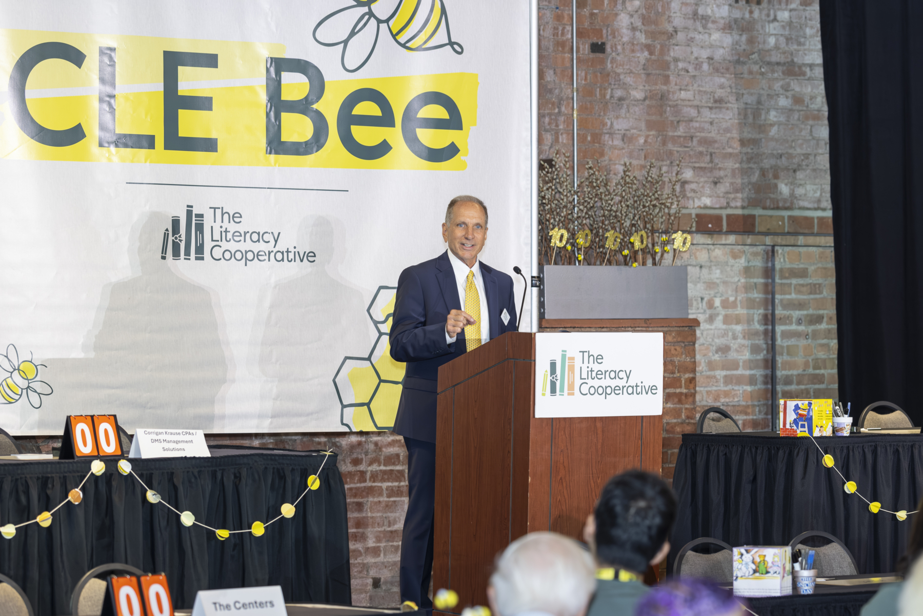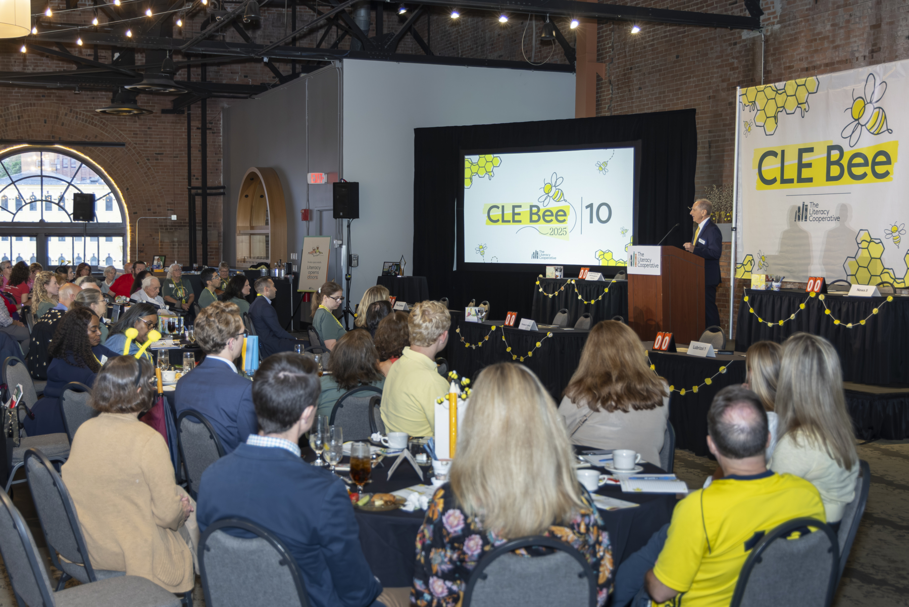 The evening began with a lively cocktail hour, setting a tone of excitement and camaraderie among the teams and guests. Board Chair Craig Dorn kicked off the main program with a warm welcome, emphasizing the collective impact of everyone in the room and introduced a video montage of the best memories from every CLE Bee since 2016. Watch it here! Bob Paponetti, President & CEO of The Literacy Cooperative, took the stage sharing Cuyahoga County’s troubling early literacy statistics and the organization’s solutions to address low literacy.